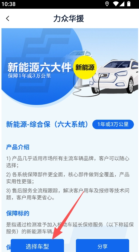 挑选目标延保产品进入详情页面,点击选择车型以查看对应的服务内容。