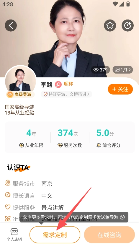 提供导游信息查看,点击导游了解等级服务次数评分及擅长领域。
