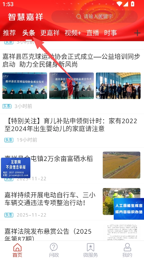 进入首页后,可浏览推荐、头条、更嘉祥等板块呈现的本地资讯内容。