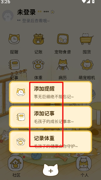 界面设计简洁明了,常用功能的布局科学合理,能够让用户迅速进入所需的养宠相关模块。