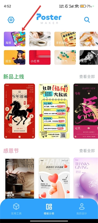 打开海报制作大师后,在模板分类页面找到并点击【海报】这一模板分类,就能进入到对应的模板列表了。
