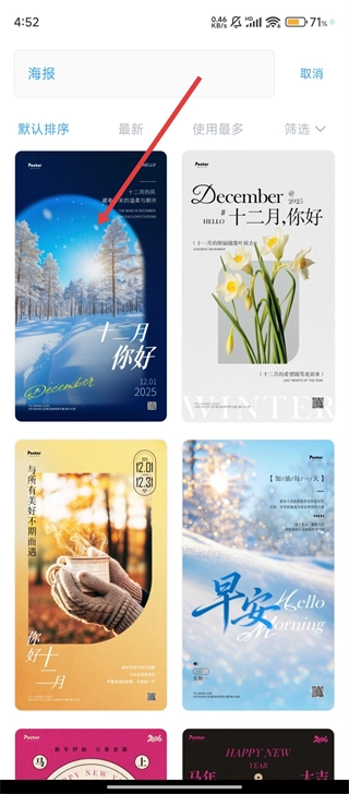 接下来在海报模板列表中,挑选你想要的模板,比如十二月主题款,点击它就能进入编辑页面啦。