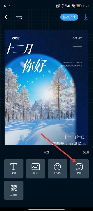 在模板编辑页面,点击底部的【贴图】选项,就能给海报添加装饰元素啦。