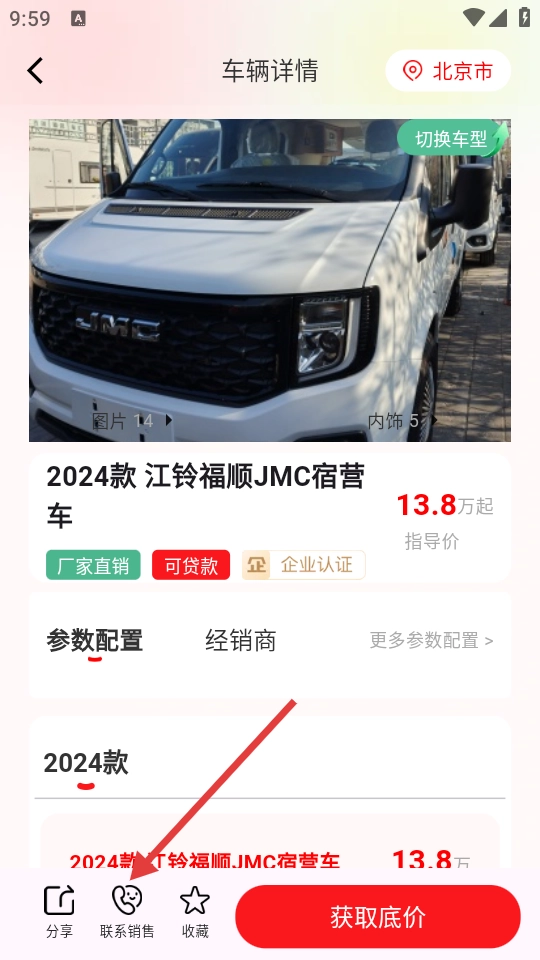 在车辆详情页面,点击【联系销售】按钮后,会弹出联系销售的相关选项。