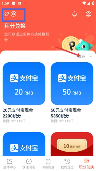 进入积分兑换页面后,你可以看到系统推荐的可兑换商品,其中涵盖了不同面额的支付宝现金等多种兑换选择。