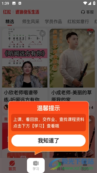 红松是一款专为中老年人打造的学习平台,这里有不少有意思的内容,遇到感兴趣的技能就去学吧,毕竟活到老学到老嘛。平台涵盖的课程十分丰富,像声乐、乐器、朗诵、书法、绘画、舞蹈等应有尽有,能让退休生活变得更充实有趣。而且还有专门的课程学习板块,汇聚了众多名师开展直播教学,比如知名营养专家顾中一、央视《星光大道》冠军王曼芝等,大家可以在家通过直播学习,还能参与互动。要是想让老年生活更充实,不妨试试红松。