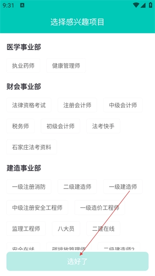 在登录页面,点击【新用户注册】选项后,要先挑选感兴趣的项目分类,选好之后再点击【选好了】按钮。