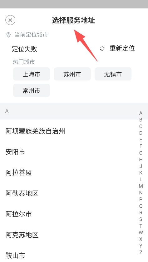 打开软件后,选择服务地址即可。该地址可通过定位获取,也能从热门城市列表中挑选。