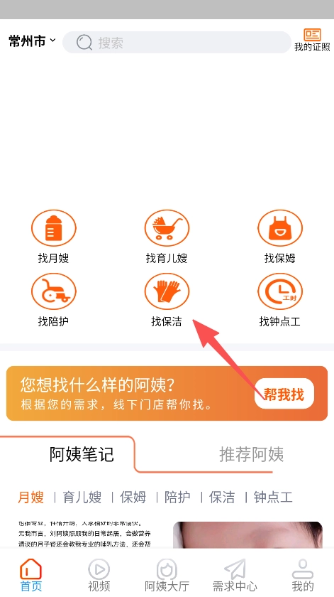 在首页选择服务类型(如找保洁、找月嫂)。