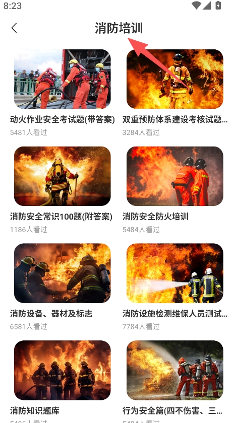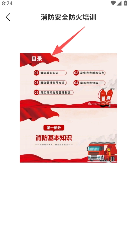 点击消防安全防火培训板块,即可浏览消防基本知识、火灾应对等相关目录以及具体的详细内容。