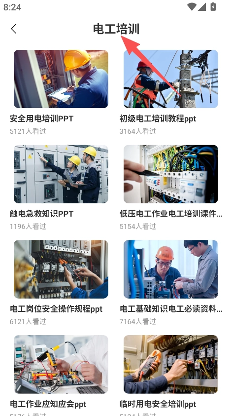 打开软件后,可选择消防培训或电工培训板块,进而浏览动火作业、防火培训、安全用电等各类培训资料。