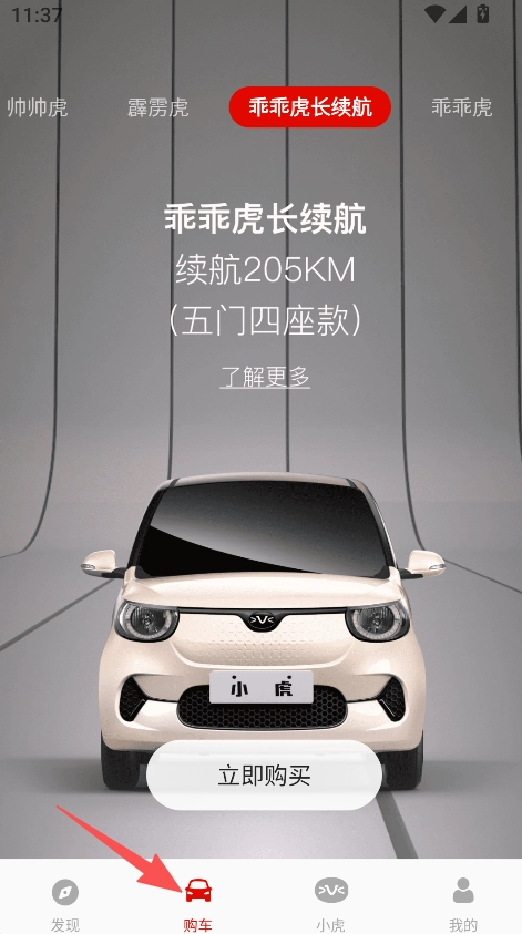 进入购车板块,选择车型(如乖乖虎长续航)。