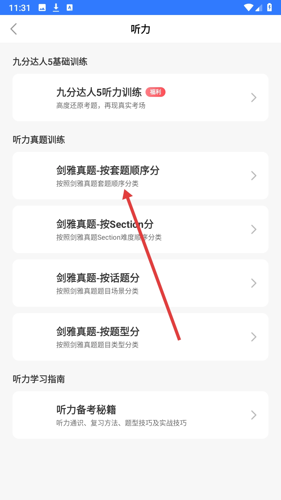 在听力学习页面点击【剑雅真题按套题顺序分】,即可进入剑雅听力真题按套题顺序分类的页面。