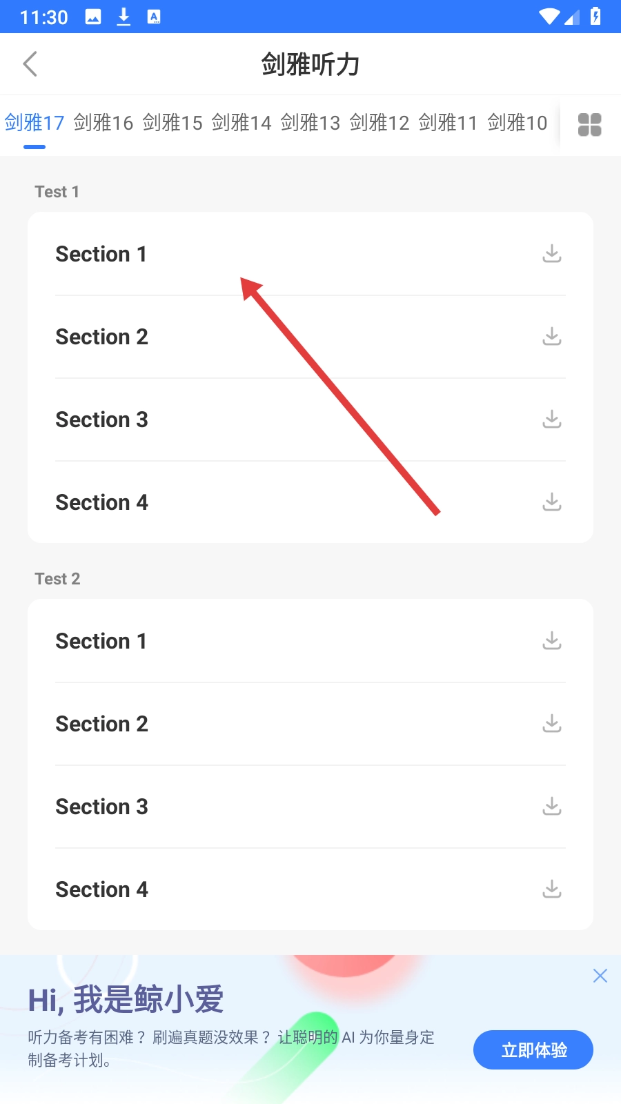 在分类页面找到你想练习的【听力真题Section】并点击,就能进入该Section对应的题目页面了。