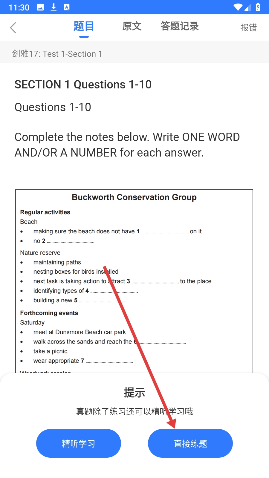 在题目页面点击【直接练题】按钮,就能开启听力真题的练习啦。