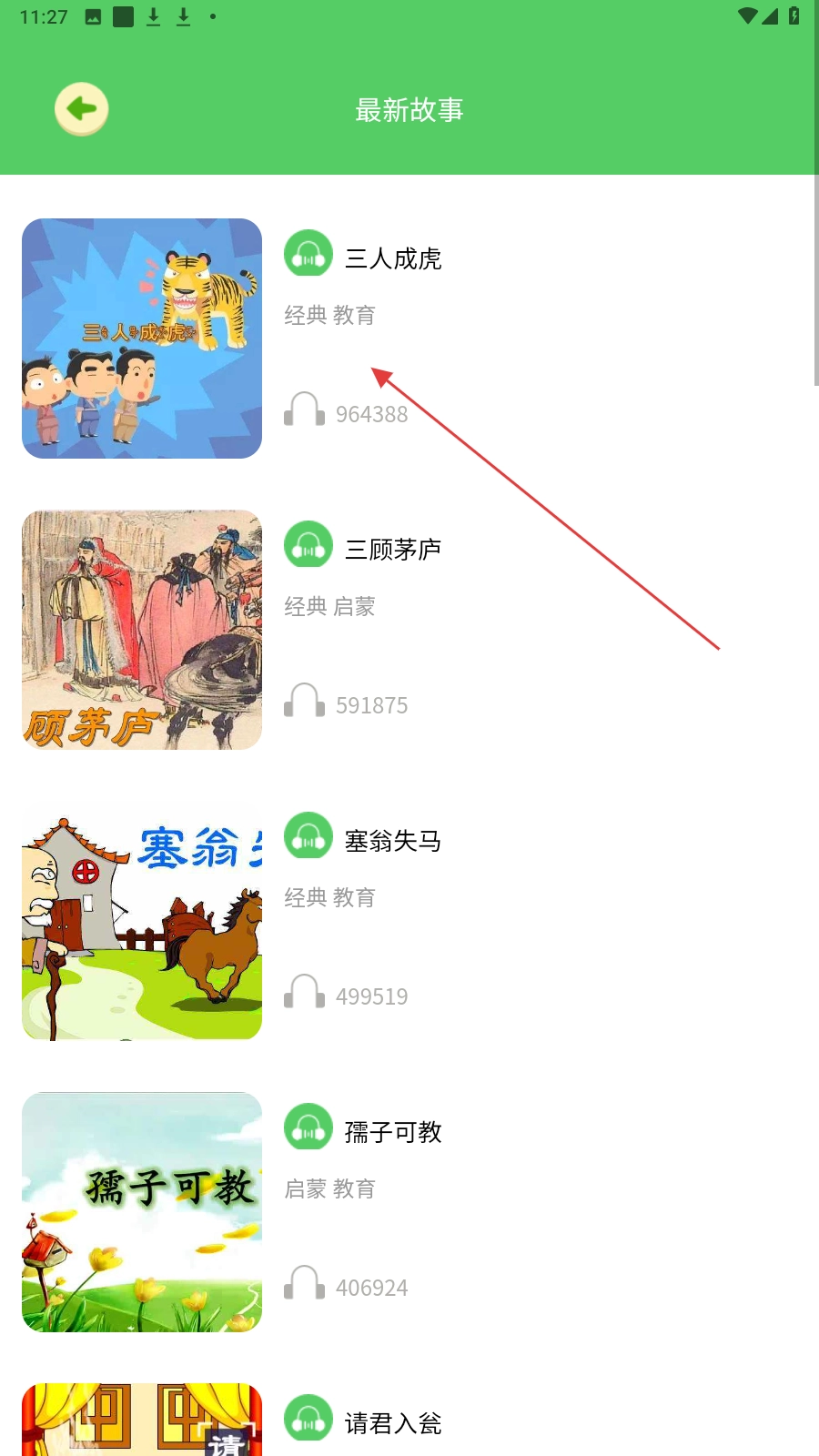 在最新故事页面,找到并点击【三人成虎】的故事卡片,即可进入该故事的播放页面。