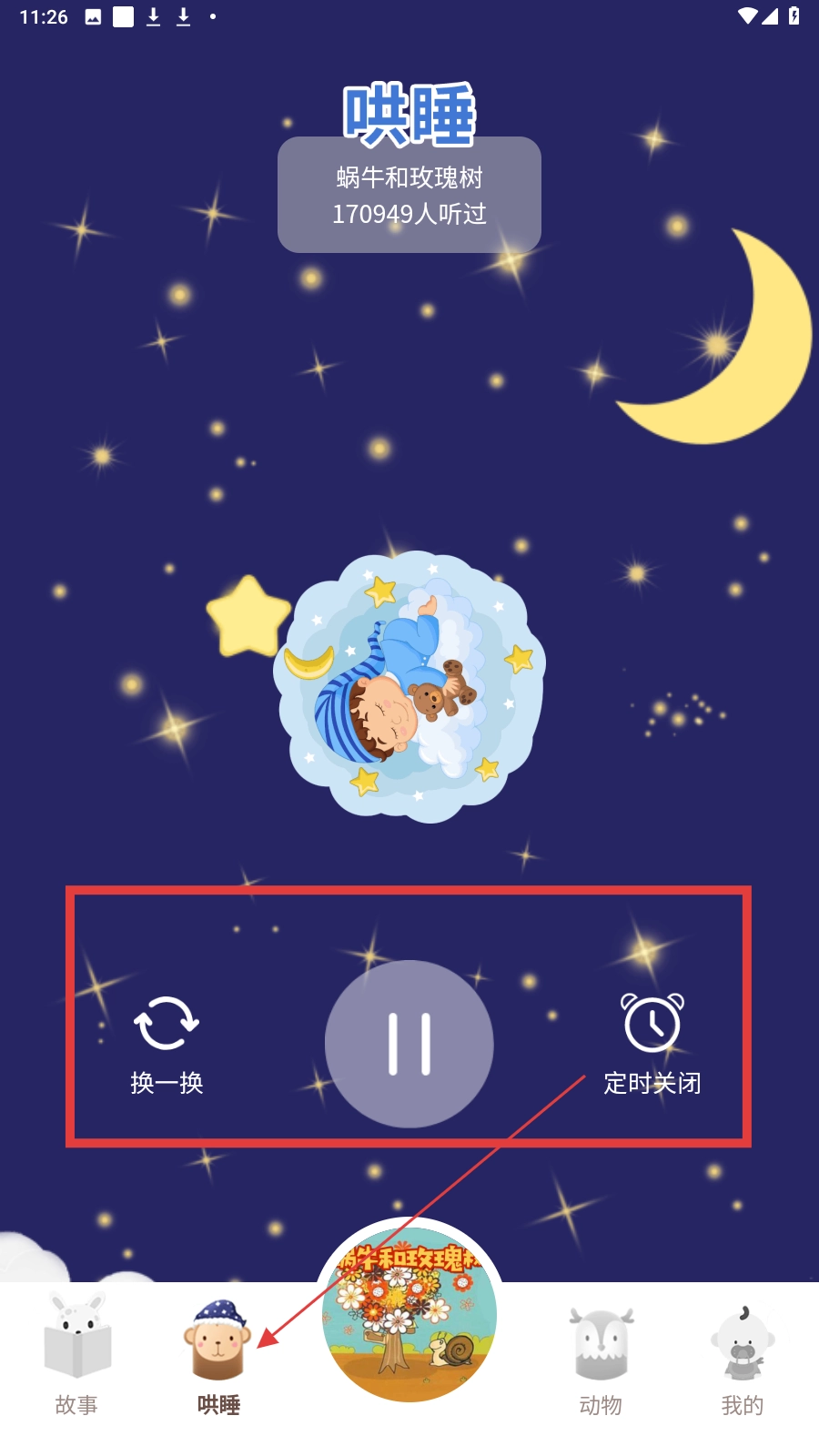 点击底部导航栏的【哄睡】按钮,进入哄睡页面后,就能更换故事或者设置定时关闭功能了。