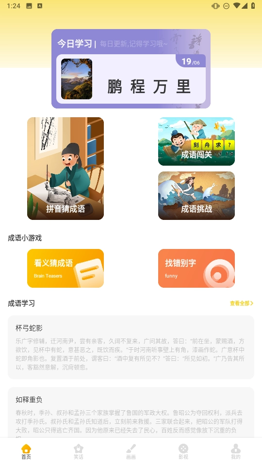 首页可参与【今日学习-鹏程万里】活动,玩【拼音猜成语】小游戏,还能阅读【杯弓蛇影】的解析来学习成语。