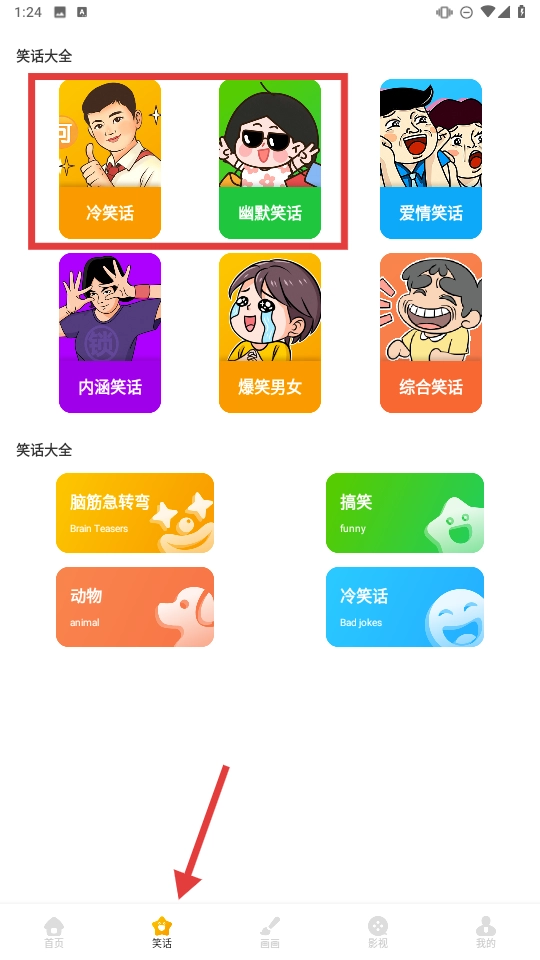 笑话页可以选择【冷笑话】【幽默笑话】分类,也能点击【脑筋急转弯】,来获取趣味内容。