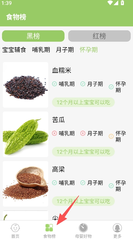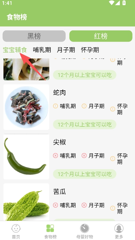 拥有食物榜单查询功能,能提供黑红榜食物清单,可满足家长对食物是否适宜的基础查询需求。