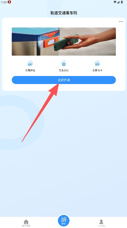 在乘车码的开通页面仔细阅读服务说明和相关权益后,点击“立即开通”按钮完成开通操作。