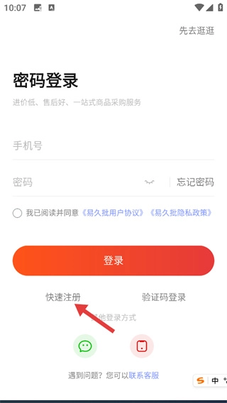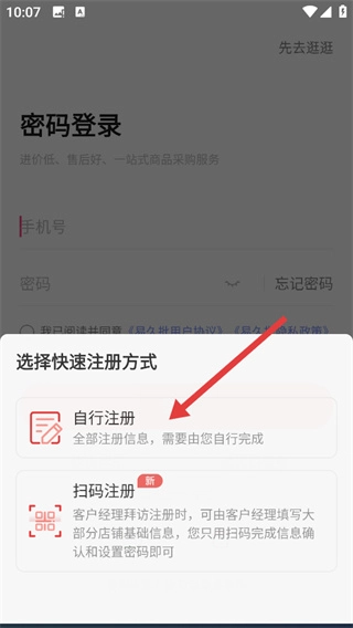 在选择框里,点击【自行注册】按钮,即可进入手机号注册页面。