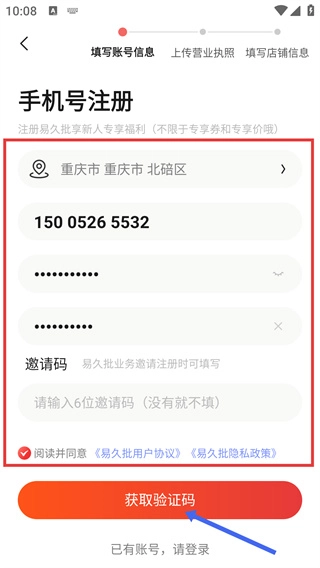 在手机号注册界面,依次填写地区、手机号、密码等相关信息,勾选同意协议后点击【获取验证码】,即可完成账号信息的填写。