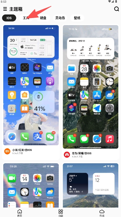 可以按照不同的分类标签来浏览主题,比如挑选IOS风格或者特定类型的桌面工具组件。