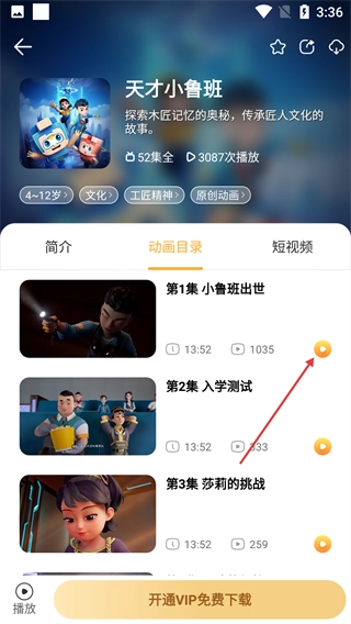 进入动画目录页面后,点击集数右边的播放按钮就能播放该集动画了。