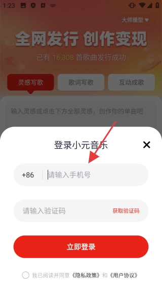 进入登录界面后,你可以通过【输入手机号并填写验证码】的方式完成登录,随后就能进入小元音乐,开启属于你的创作之旅了。
