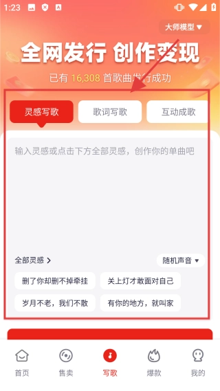 进入写歌界面后,你可以从【灵感写歌】和【互动成歌】两种模式中任选其一,体验写歌服务。