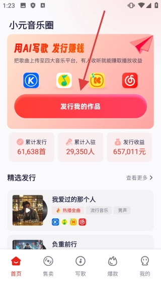 进入首页后,你可以查看小元音乐圈,也能发行自己的作品,体验音乐发行和收益相关服务。