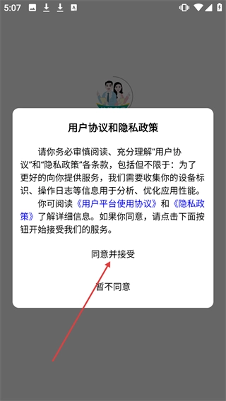 在用户协议与隐私政策的弹窗里,点击【同意并接受】按钮,就能启动应用服务的使用流程了。