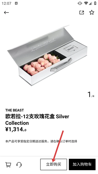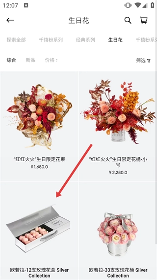 你可以从生日花列表里挑选想要的花品,比如【欧若拉-12支玫瑰花盒SilverCollection】,然后点击进入该商品的详情页面。