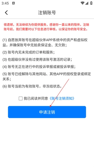 在账号注销说明页面勾选同意《账号注销须知》后,点击【申请注销】按钮即可完成账号注销流程。