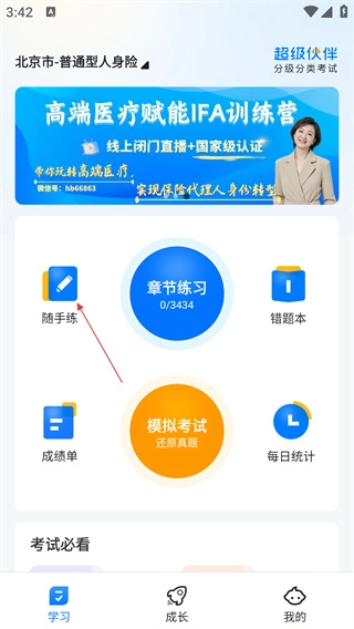 在首页点击【随手练】功能图标,即可进入模拟考试信息页面。