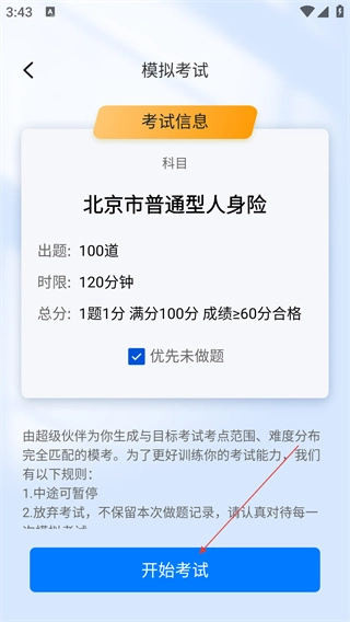 在模拟考试信息页面确认考试信息无误后,点击【开始考试】按钮即可进入答题环节。