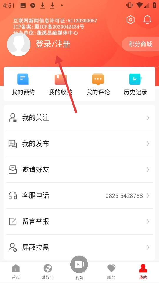 在个人中心页面,点击【登录/注册】按钮。