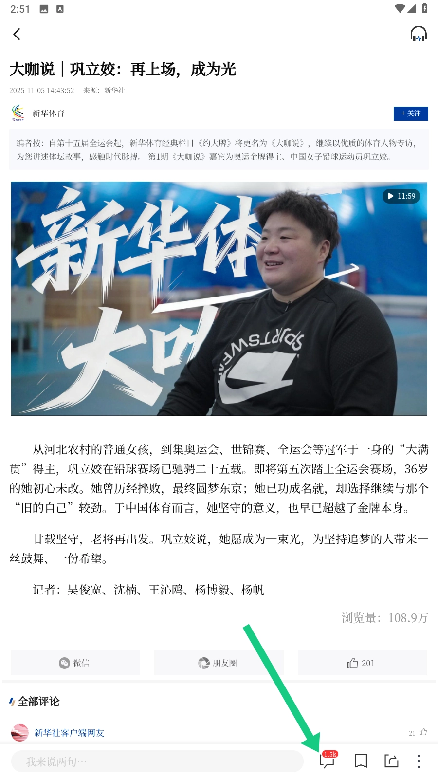 在体育板块里,你可以点击自己感兴趣的新闻,比如【大咖说-巩立姣】这篇,就能进入文章的详情页面啦。