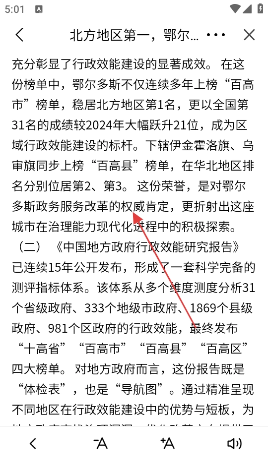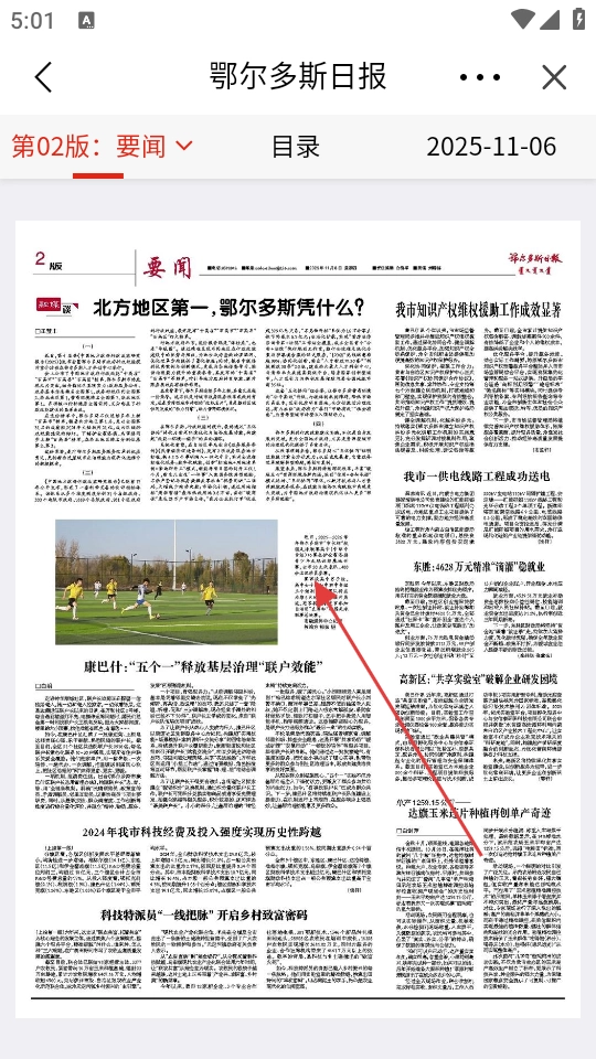 在报纸阅读界面中,点击想要查看的新闻文章(例如《北方地区第一,鄂尔多斯凭什么?》),即可进入该文章的详情页面。