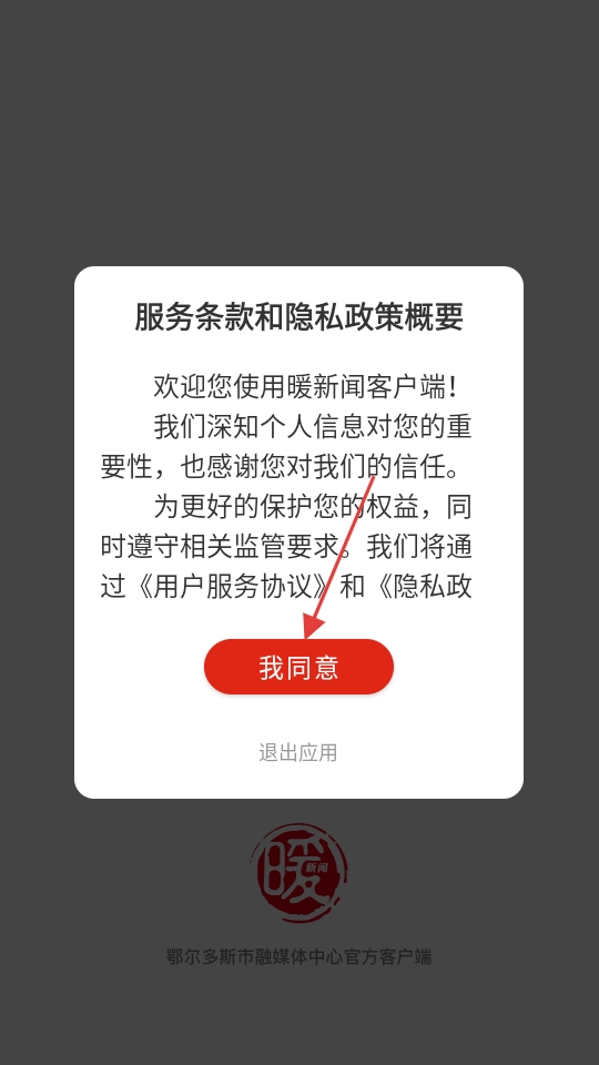 在服务条款与隐私政策的概要页面,点击【我同意】按钮后,即可进入暖新闻客户端的主界面。