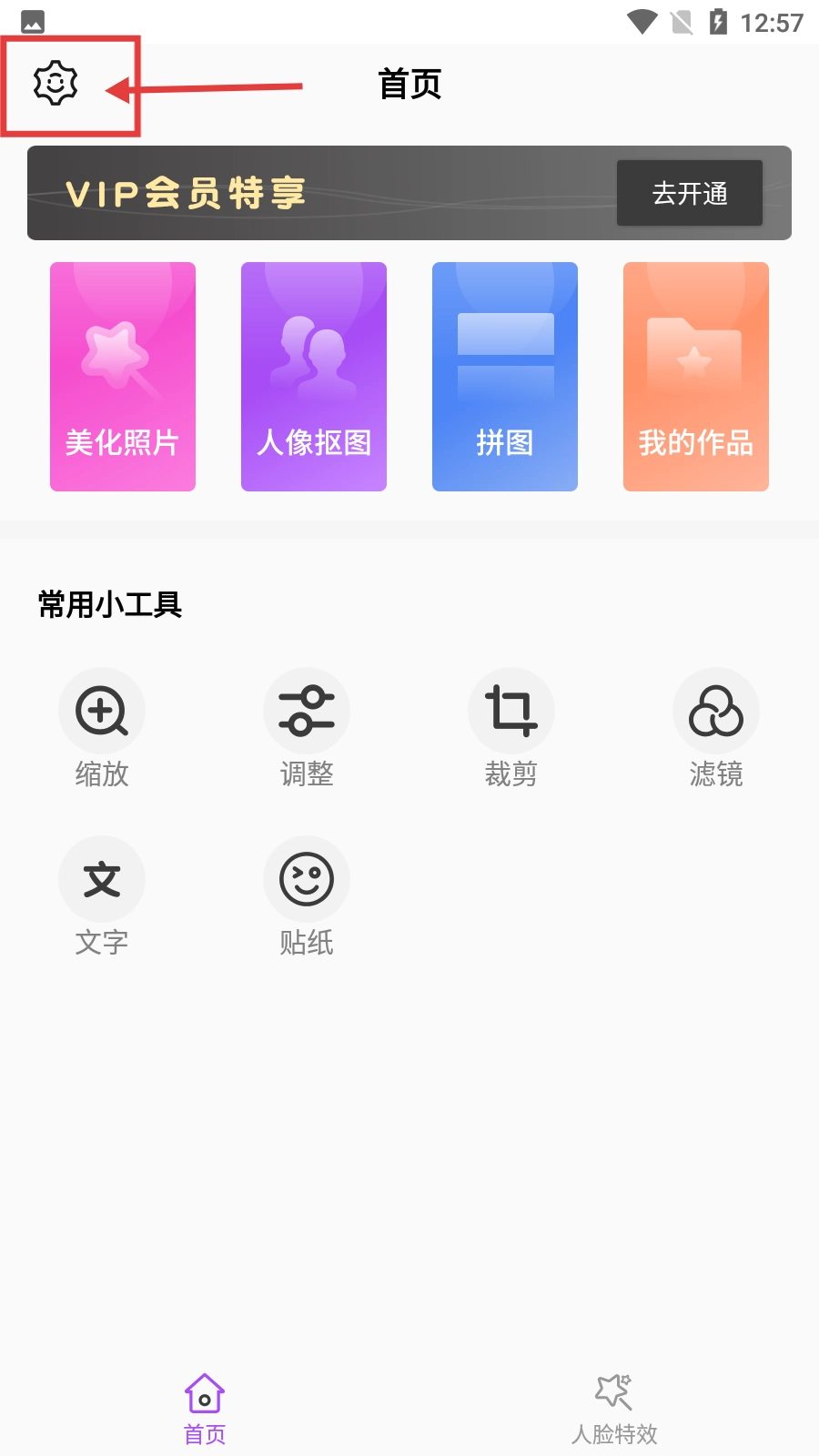 打开图片美化软件后,点击左上角的设置图标,就能进入具备登录/注册等功能的设置界面。