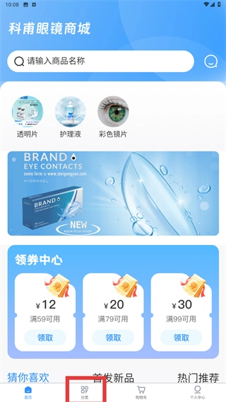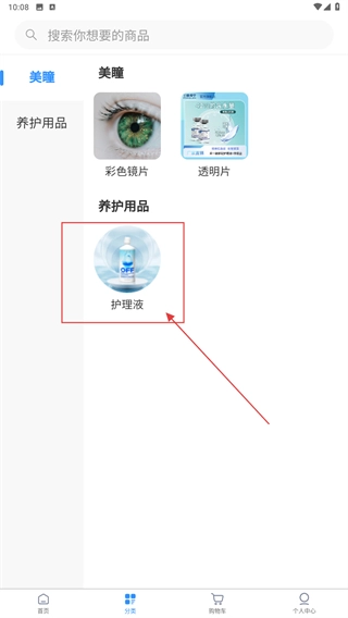 点击底部的【分类】按钮,就能进入商品分类页面,在那里可以查看【美瞳】-【养护用品】等各类商品分类,有助于更便捷地挑选商品。