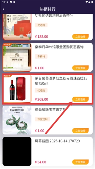在热销排行榜里找到【茅台葡萄酒-梦幻之秋-赤霞珠西拉13度-750ml】,点击【立即查看】按钮进入商品详情页。