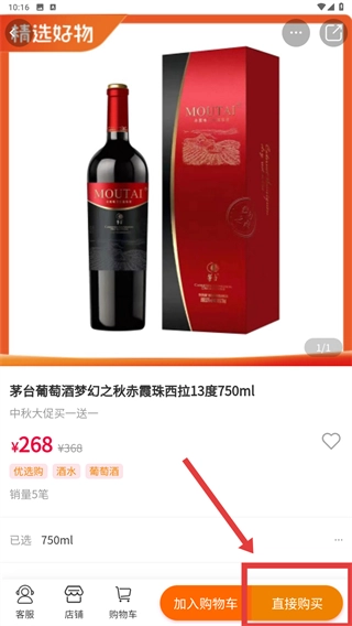 在购买确认界面调整好商品数量后,点击【直接购买】按钮,即可完成【茅台葡萄酒-梦幻之秋-赤霞珠西拉13度-750ml】的购买流程。