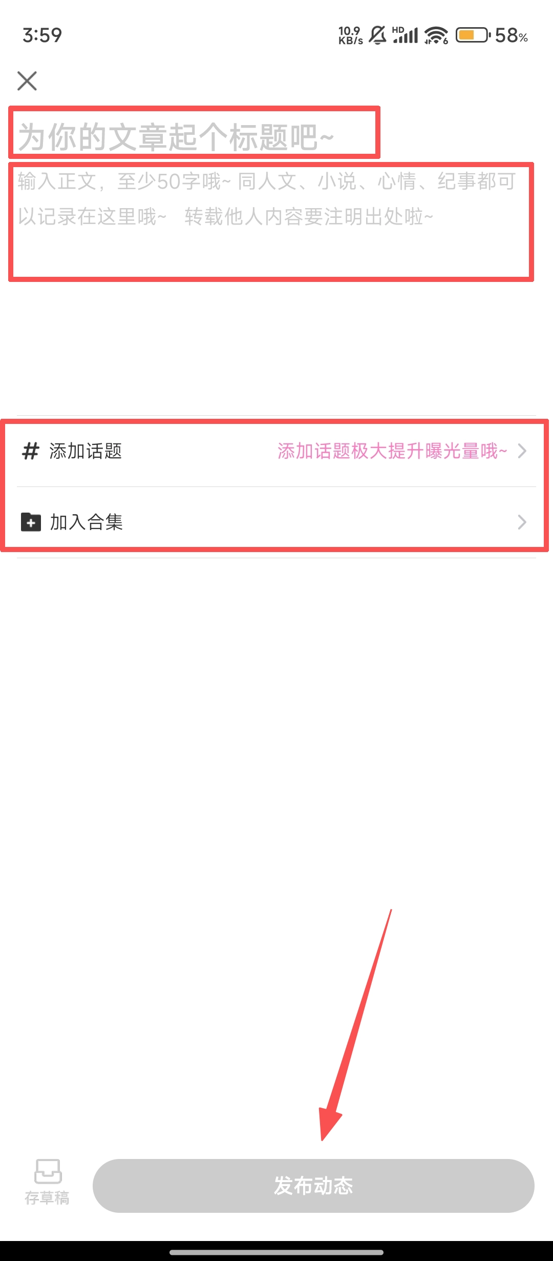 在创作页面,把标题、正文填写好,再添加话题和合集,之后点击【发布动态】按钮,就可以顺利发布了。