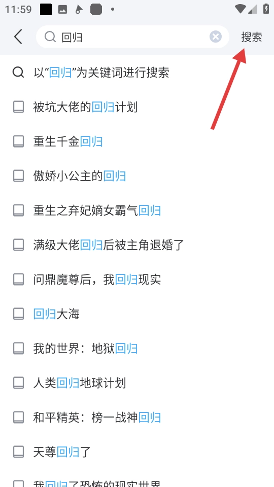 在搜索框中输入关键词后,点击右侧的【搜索】按钮,即可获取相关的小说列表。
