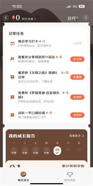 完成图中所示的日常任务后,能获得积分奖励;每日进行签到,同样也可以获取积分。