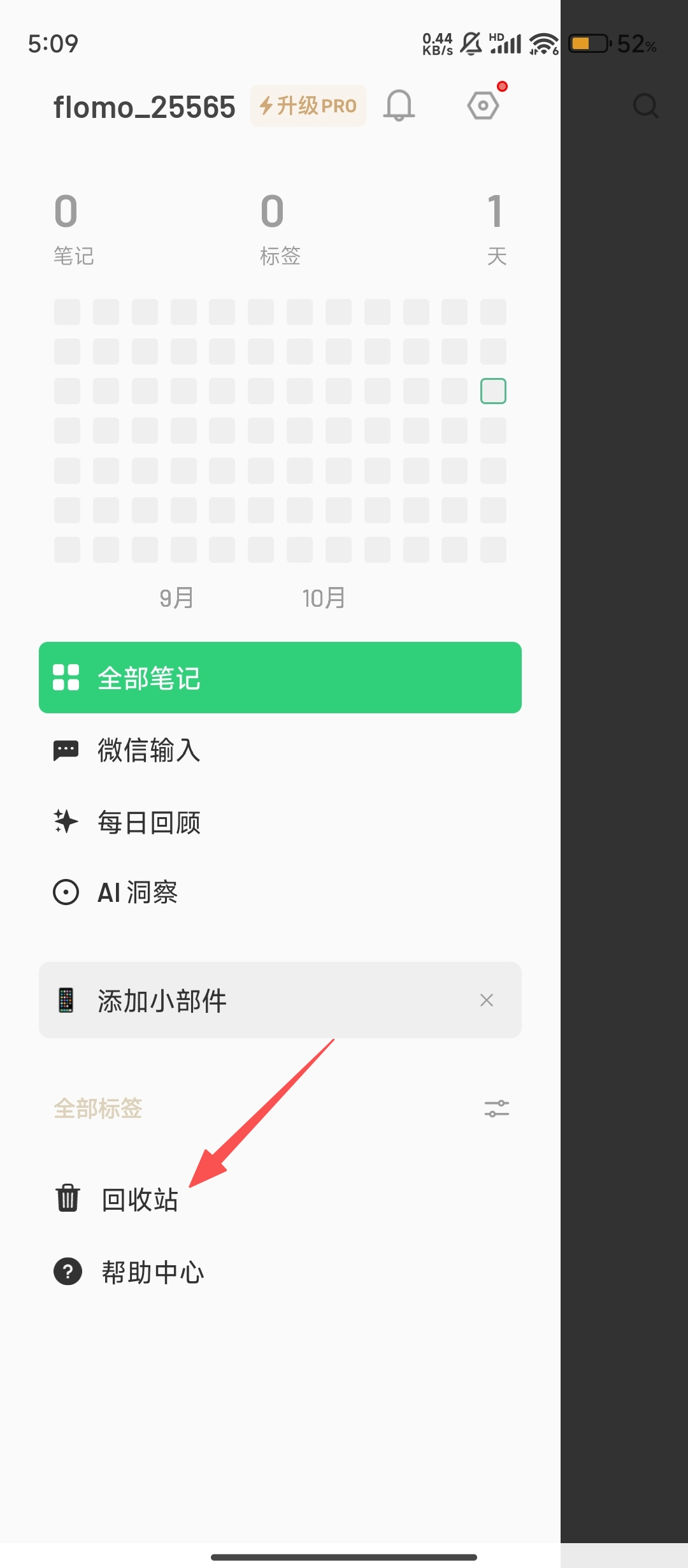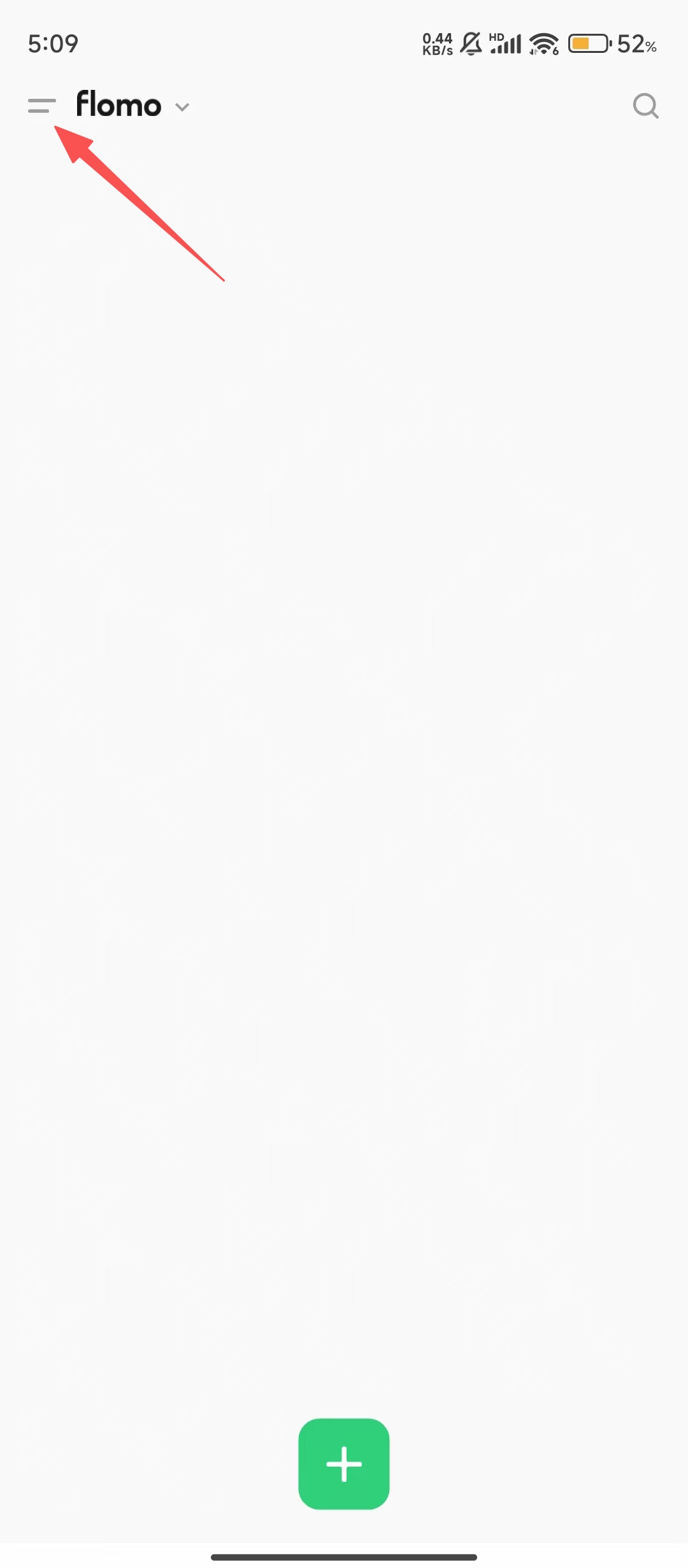 打开flomo应用,点击界面左上角的菜单按钮,待侧边栏展开后,即可启动清空回收站的相关操作流程。