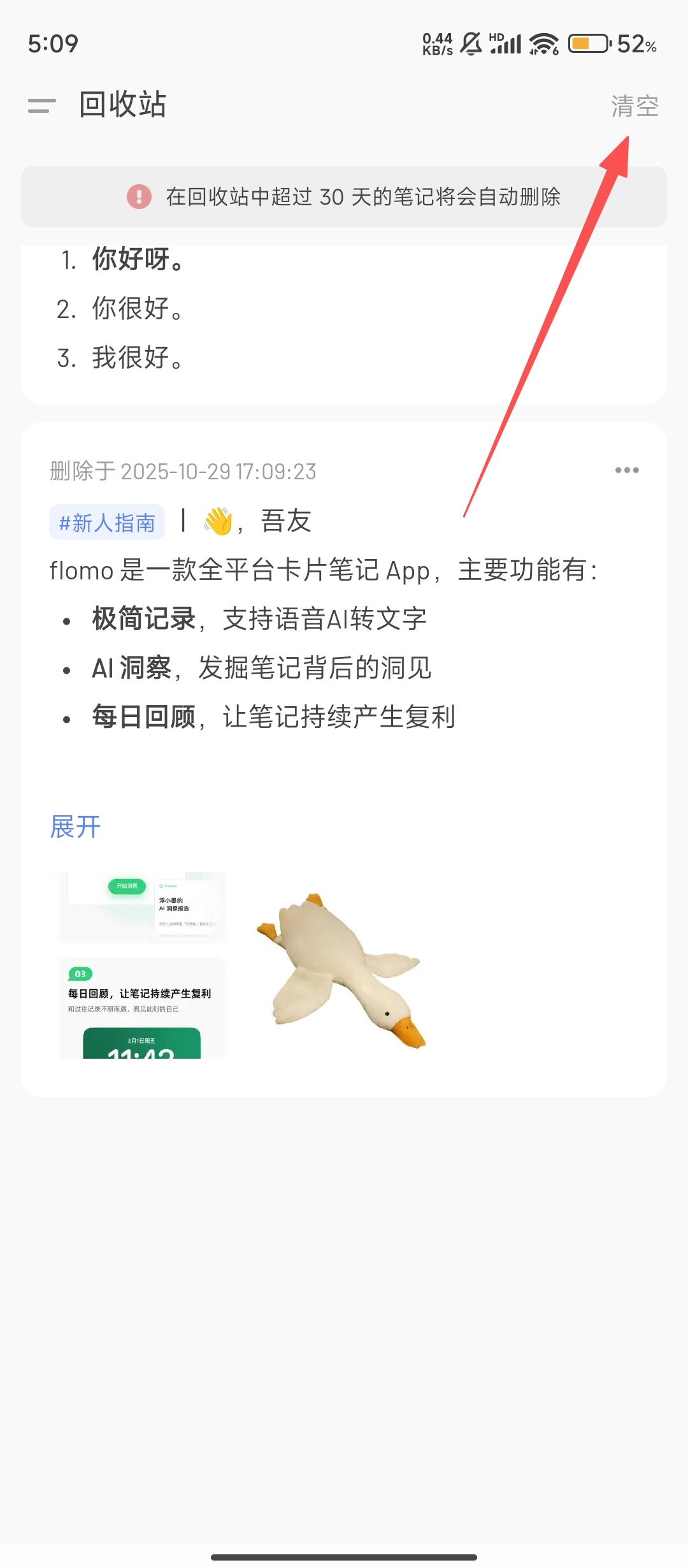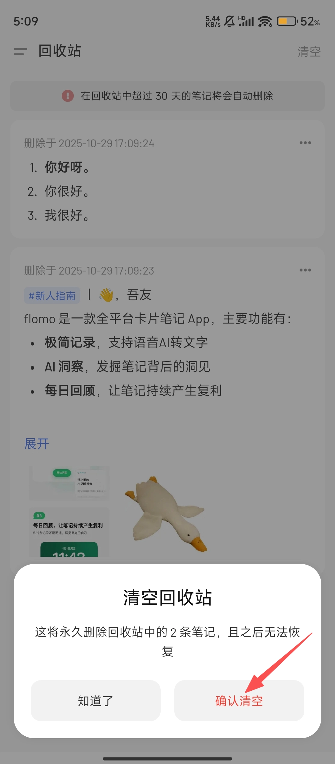 在【清空回收站】的提示框里,点击【确认清空】按钮,就能把回收站里的笔记永久删除啦。